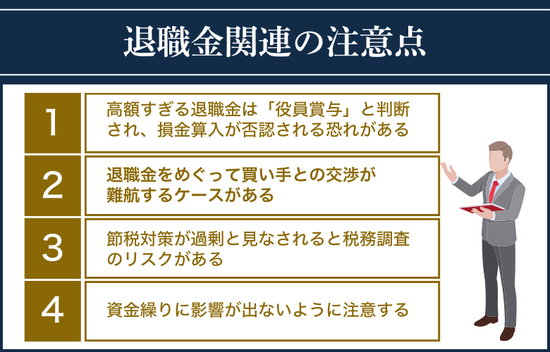 会社売却は、経営者にとって大きな転換期であり、退職金の取り扱いには特に注意が必要です。ここでは、会社売却における退職金に関連する重要な注意点を解説します。