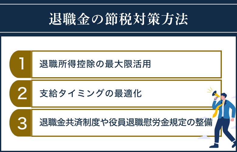 会社売却を成功させるためには、退職金の取り扱いだけでなく、節税対策も重要なポイントです。ここでは、会社売却時における退職金の節税対策として、よく行われている方法を3つご紹介します。